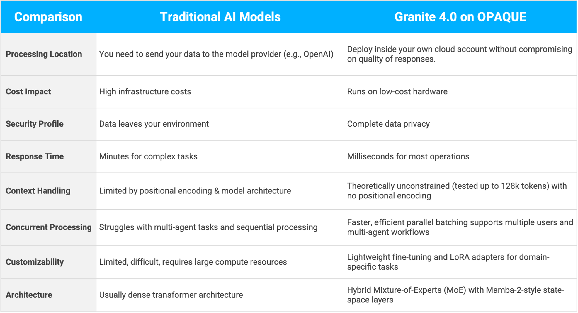 Security and AI usually don't play well together. Most organizations either sacrifice speed for privacy or privacy for speed. OPAQUE changes this dynamic by creating a secure foundation for Granite 4.0 to handle your sensitive data.