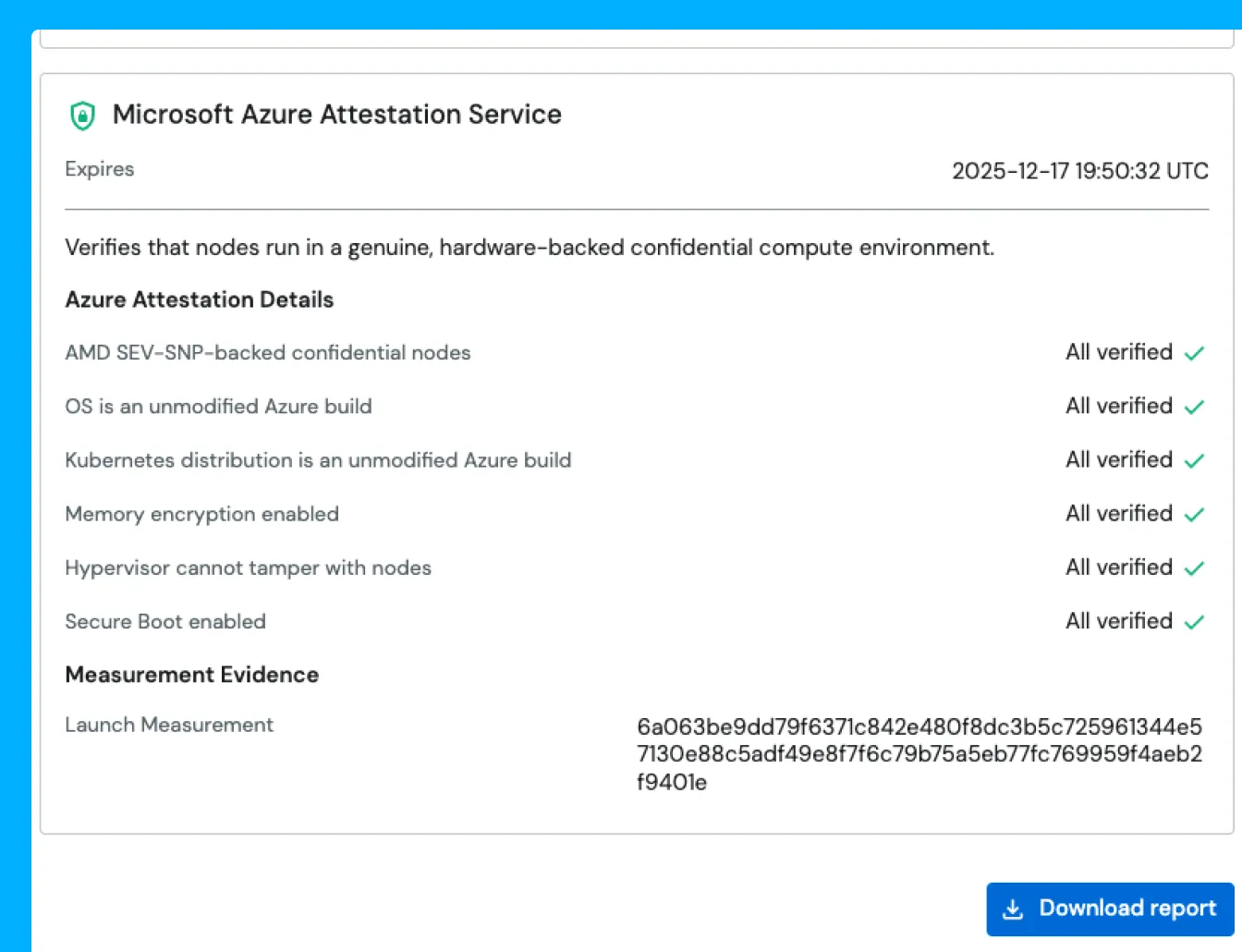 - Attestation reports provide verifiable (measurements) for the integrity of the computing stack: confidential computing hardware (CPUs and GPUs); infrastructure (confidential VMs and Kubernetes environment); and all OPAQUE platform binaries, container images, and configurations.